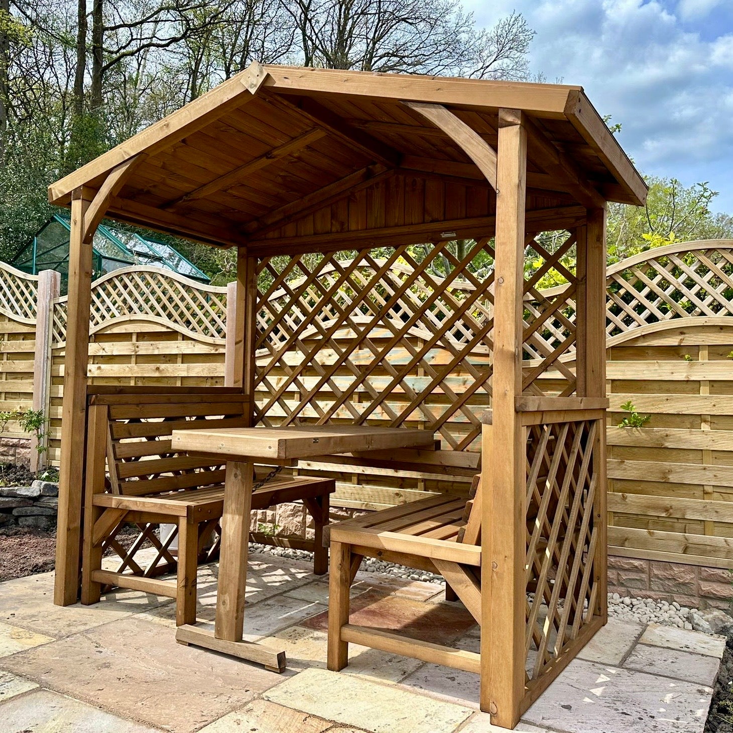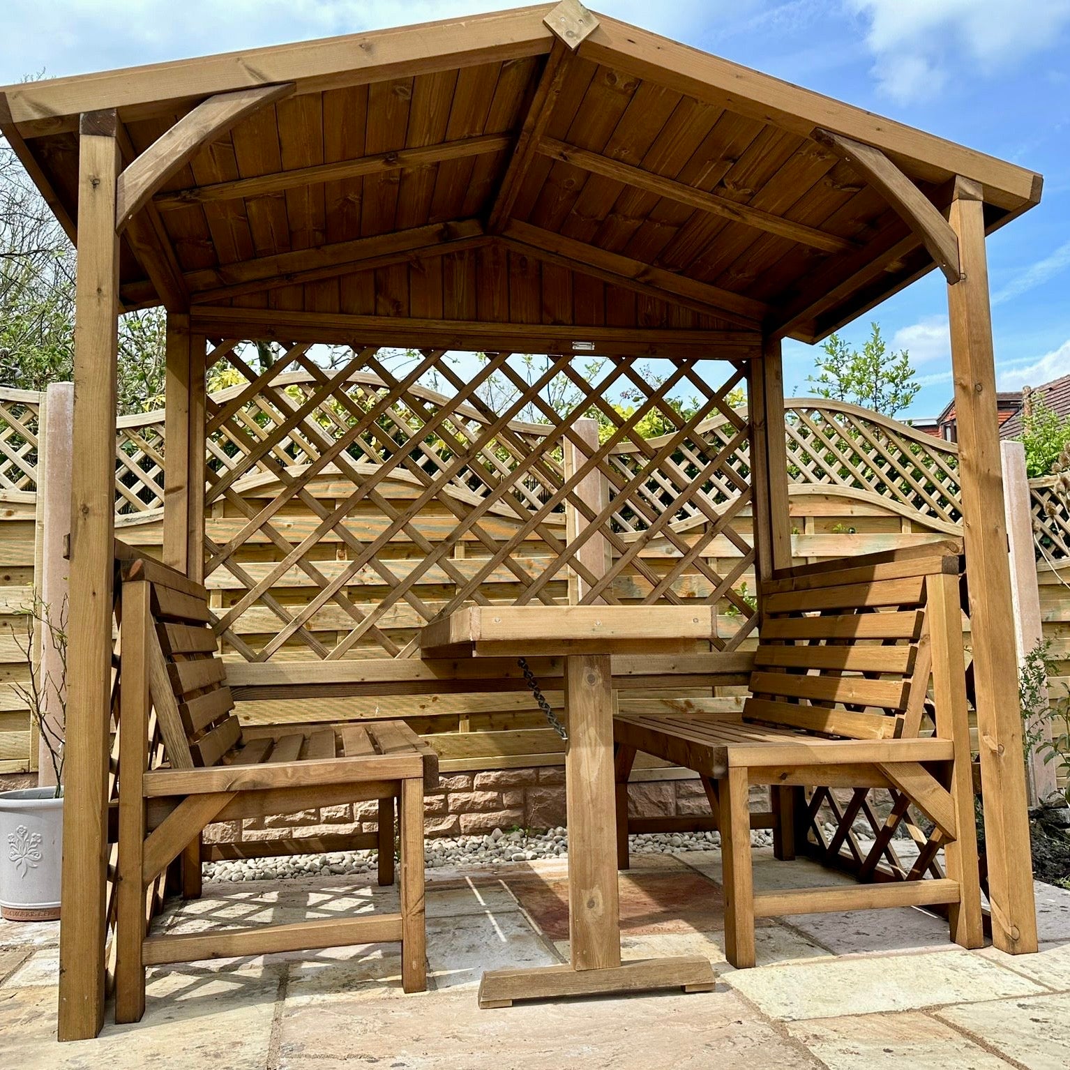 This Aylesbury Arbour fits perfectly into smaller gardens that are unable to accommodate larger patio sets or for larger gardens to create an instant beautiful feature.Featuring x 2 removable seat benches and large centre table which neatly folds away giving you the option of an outdoor dining area or sheltered seating / bbq area.