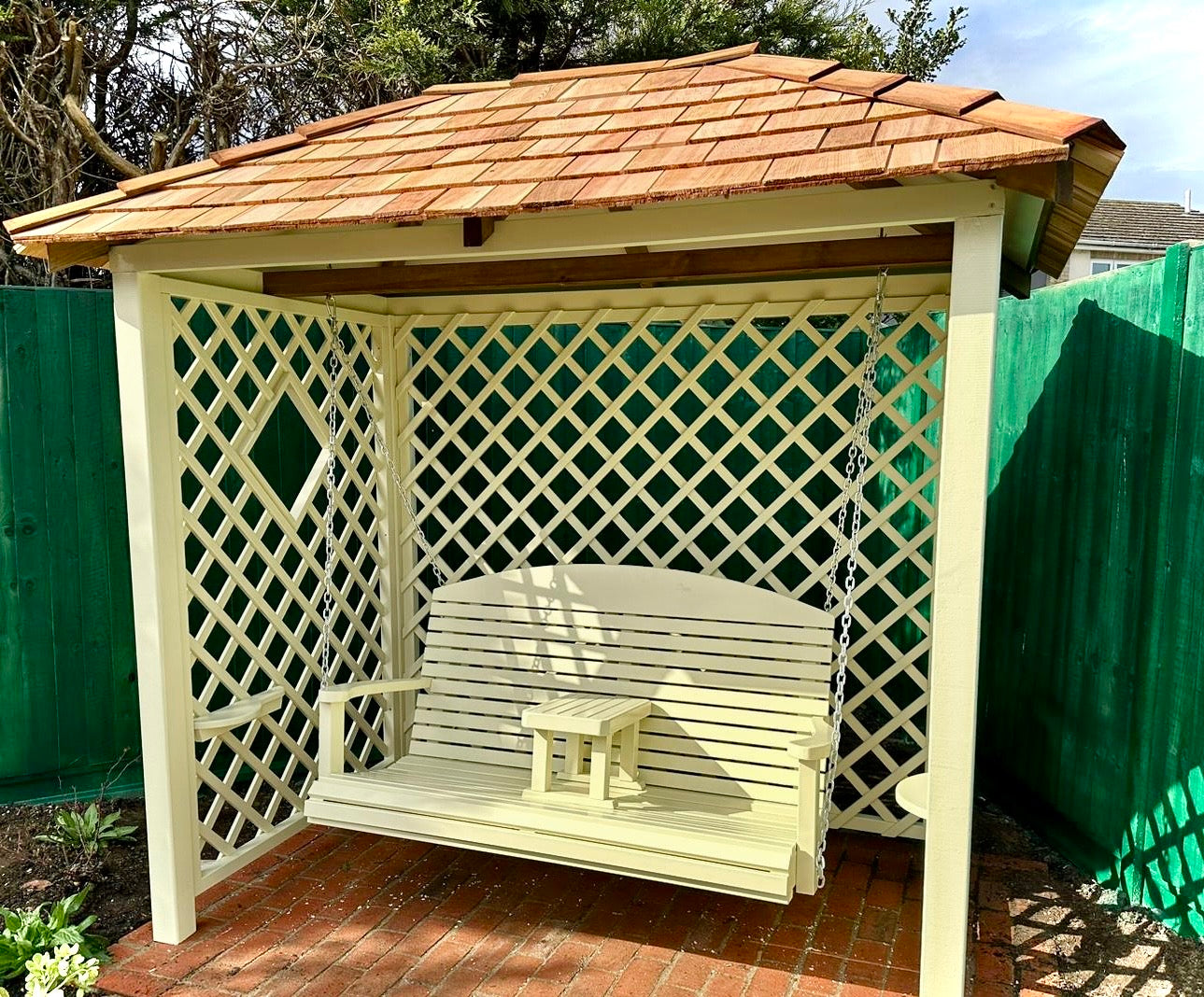 This painted garden swing is made from sustainable Pressure Treated Scandinavian Redwood, a high-quality frame supports a trellis structure and a traditional Red Cedar shingle roof.