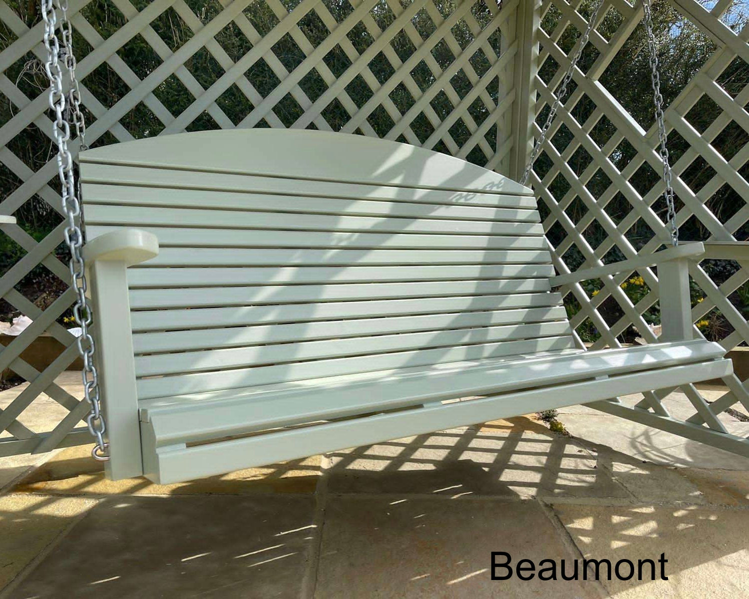 The swing itself is a comfortable 3 seat, High Back Cradle and comes with a removable arm-rest centre table along with fixed drinks shelves on the frame sides. Our Beaumont swing cradle is an alternative seat option which also comes with a removable centre armrest.