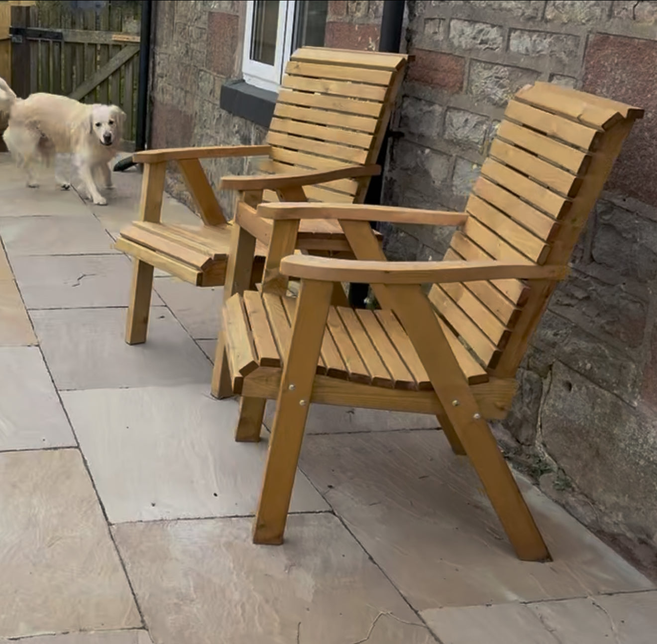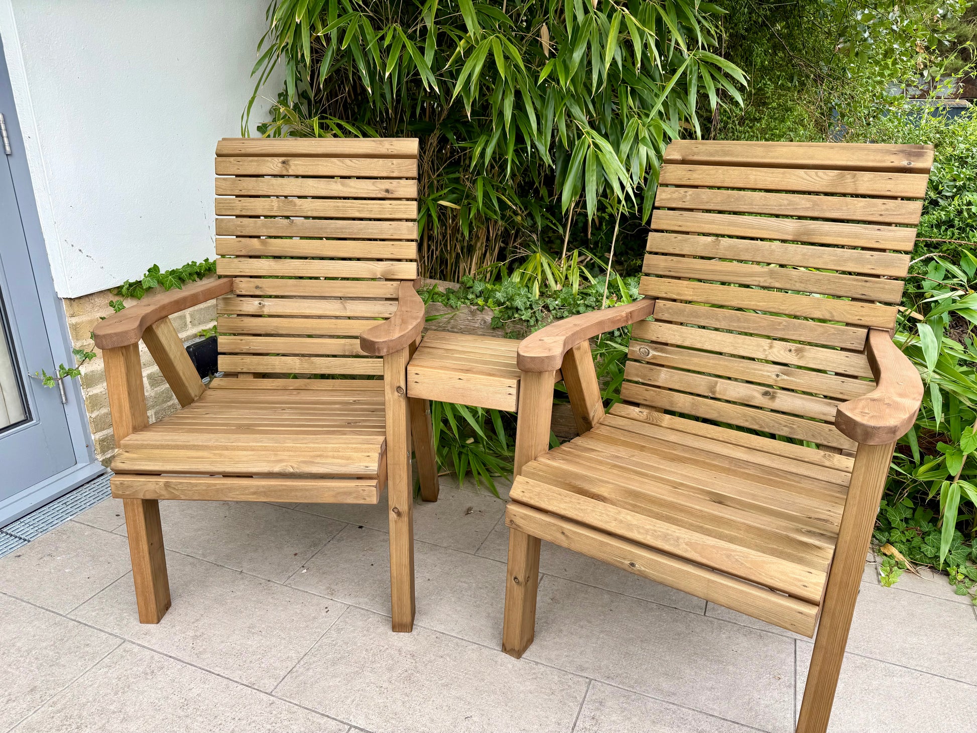 This set includes two beautifully handcrafted chairs, accompanied by a detachable joining table. You'll appreciate the curved arms, contoured seating, and elevated back of these chairs, ensuring a truly comfortable experience. Made from pressure treated Scandinavian Redwood.
