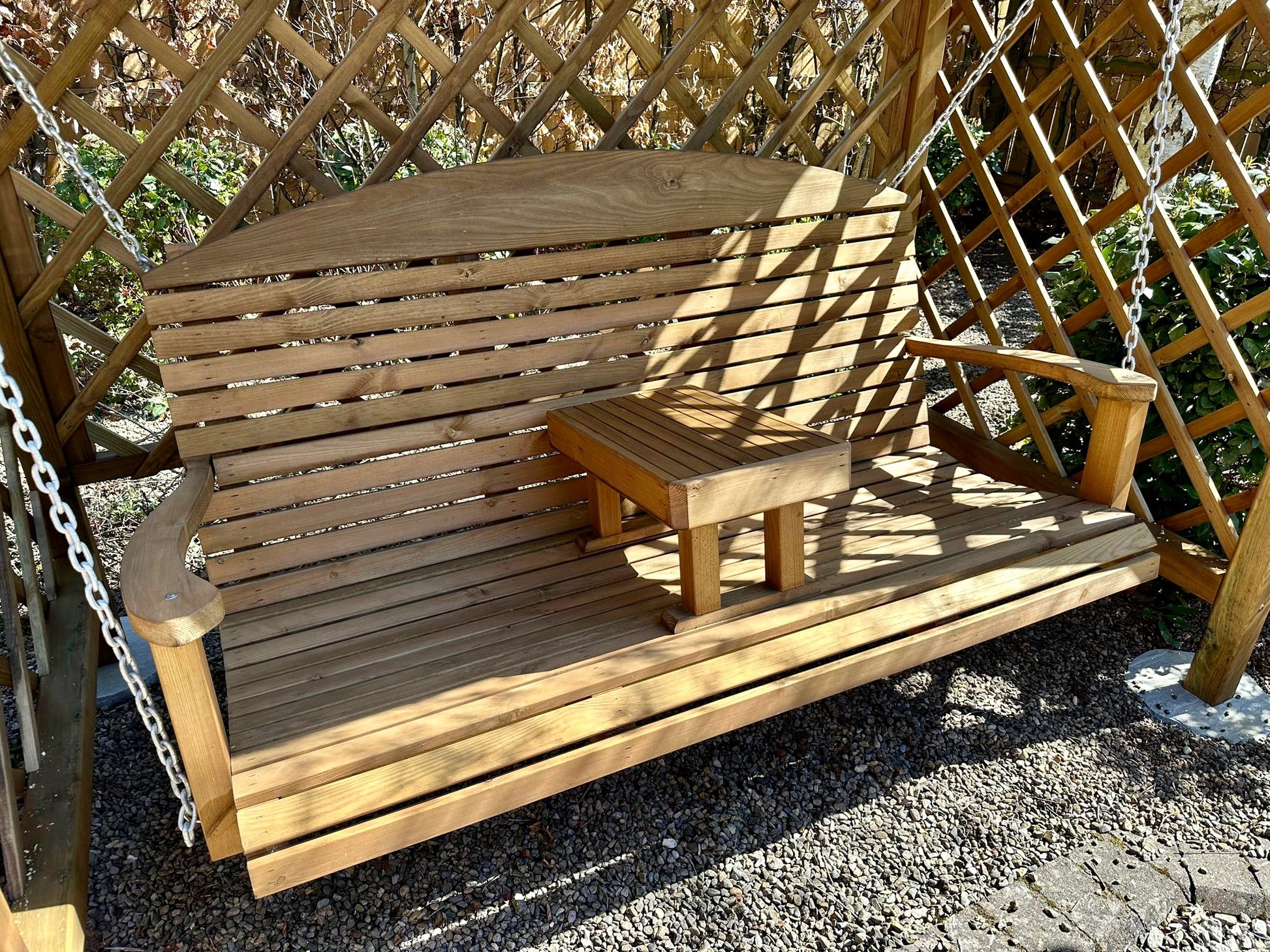 This beautiful handmade wooden garden swing seat is made with the highest quality Scandinavian Redwood which has been pressure treated.
