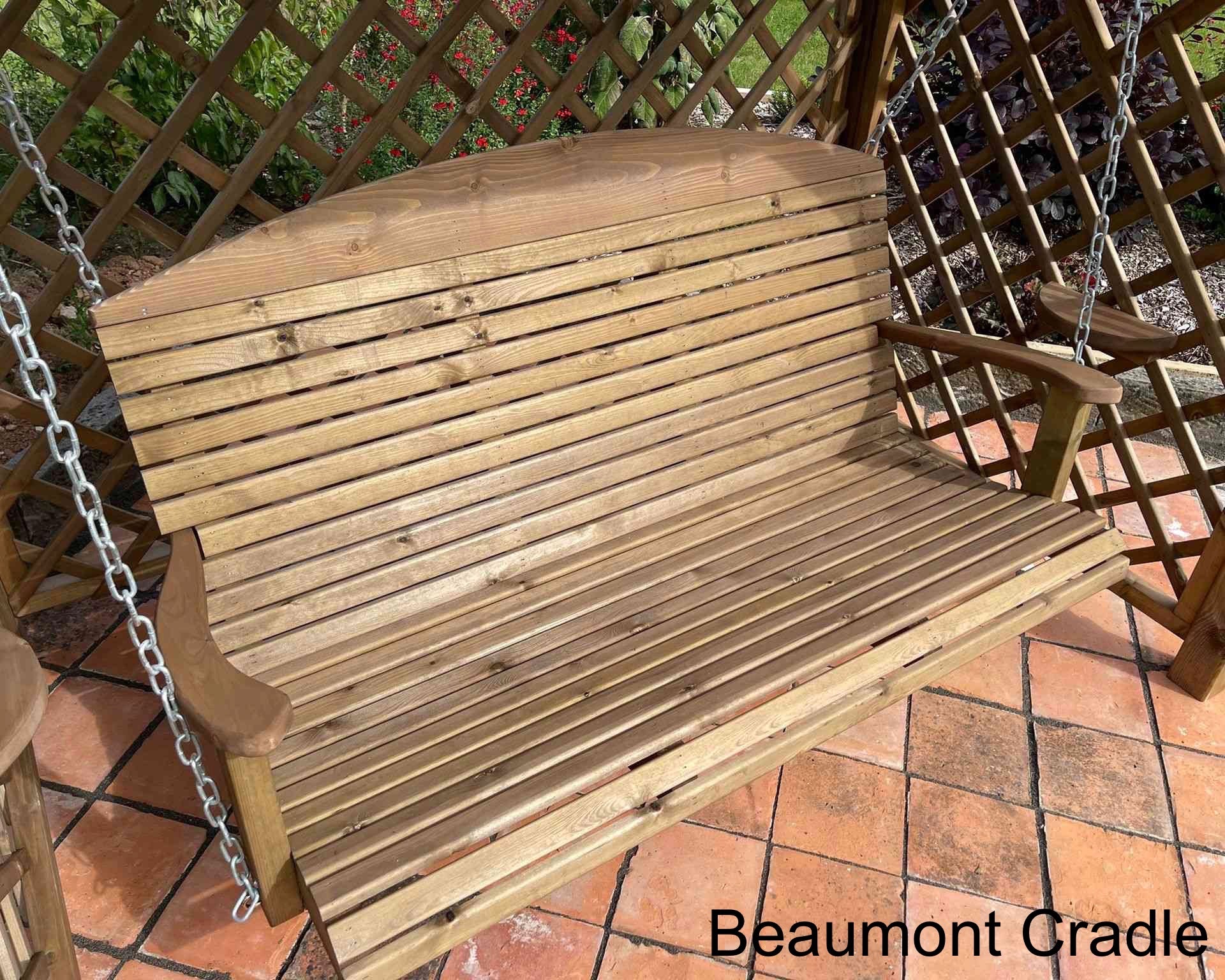 The Swing is available as a 2 seat or 3 seat. The 3 seat has the option of a removable centre armrest. You can choose from our Avebury Cradle as standard or upgrade to the Beaumont Cradle. High back Cushions are available as well as various size planters.