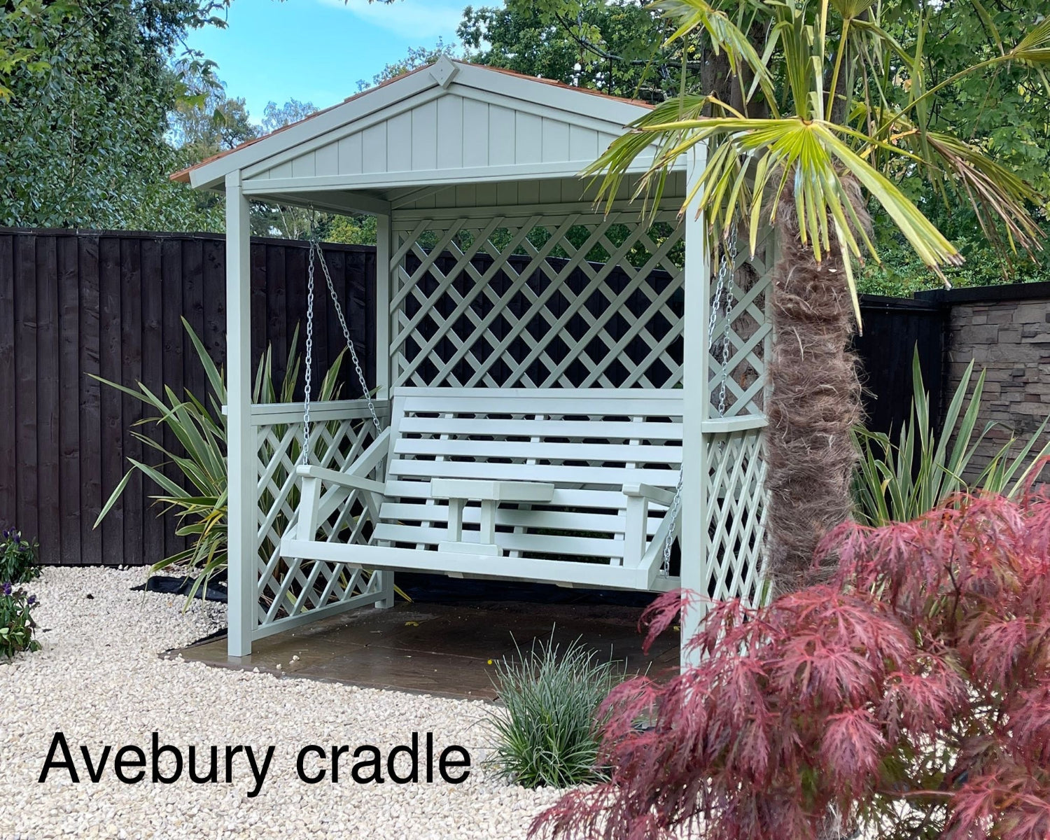 The Blenheim swing is made from pressure treated Scandinavian Redwood, the frame consists of a trellis surround with enclosed gables. The roof is tiled with Red Cedar shingles.