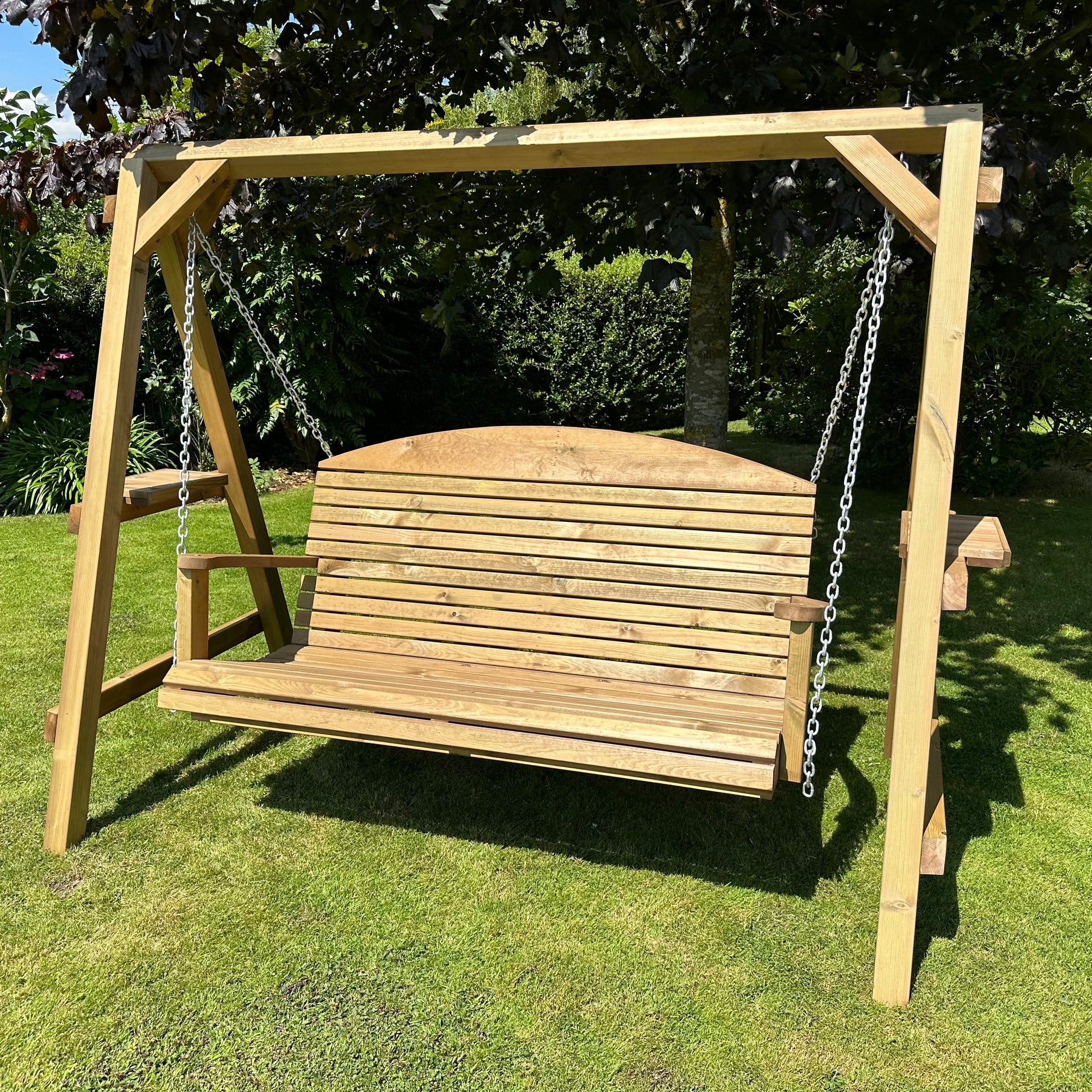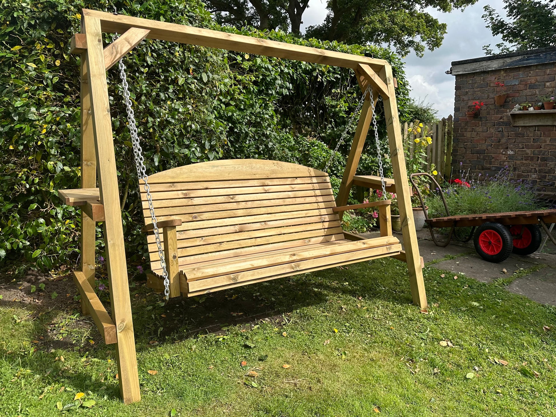 This beautifully handmade wooden garden swing seat is made with the highest grade Scandinavian Redwood which has been Pressure Treated.